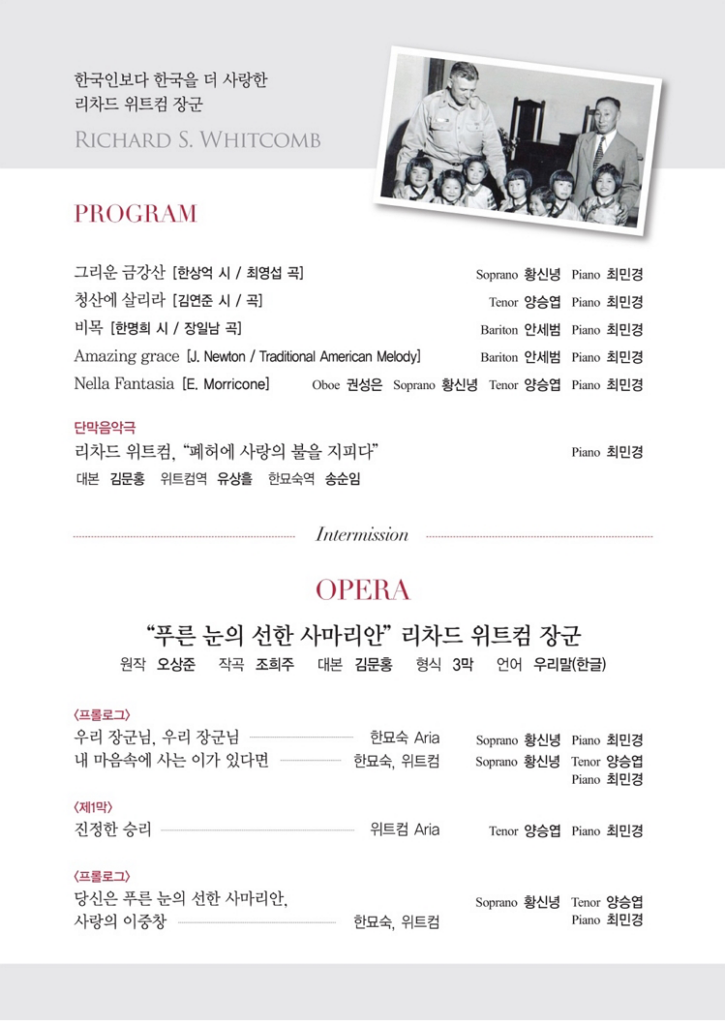 먼 타국의 평화와 도약을 위해 헌신하신 리차드 위트컴 장군을 추모하고 기념하는 일은 후손들에게 큰 깨우침을 전하는 동시에 인류의 평화를 위한 숭고한 인류애와 헌신의 자세를 되새기는 소중한 기회가 돌 것입니다. 아름답고 웅장한 오페라를 통해 추모와 감사의 메시지가 따뜻한 감동과 함께 전해진 것으로 기대합니다.